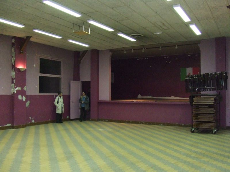 la scène : on la masquerait et on utilise l'espace devant. On entre sur scène par la petite porte au fond (ou bien on arrive de tous côtés ?)